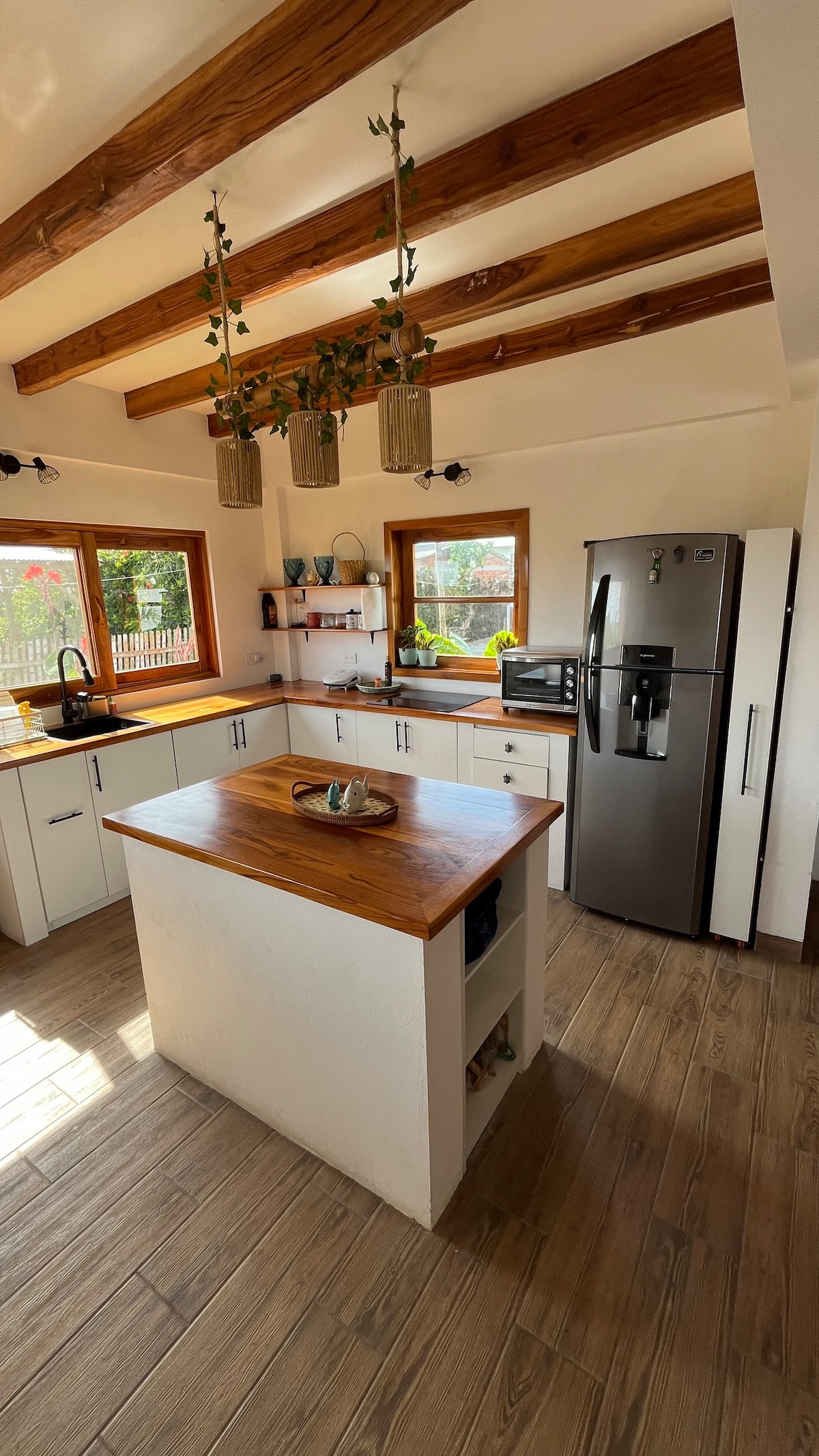 Our house offers modern amenities in a quiet, relaxing, and safe neighborhood. Enjoy beautiful green and sky views from your bed and throughout the house. The property features a spacious backyard, a comfortable patio with a hammock, a fully equipped kitchen, private parking, and peaceful surroundings. Located less than a minute by car (or 10-minute walk) from downtown Manglaralto, you’ll find grocery stores, bakeries, restaurants, and more nearby. Montañita is just five minutes away by car.