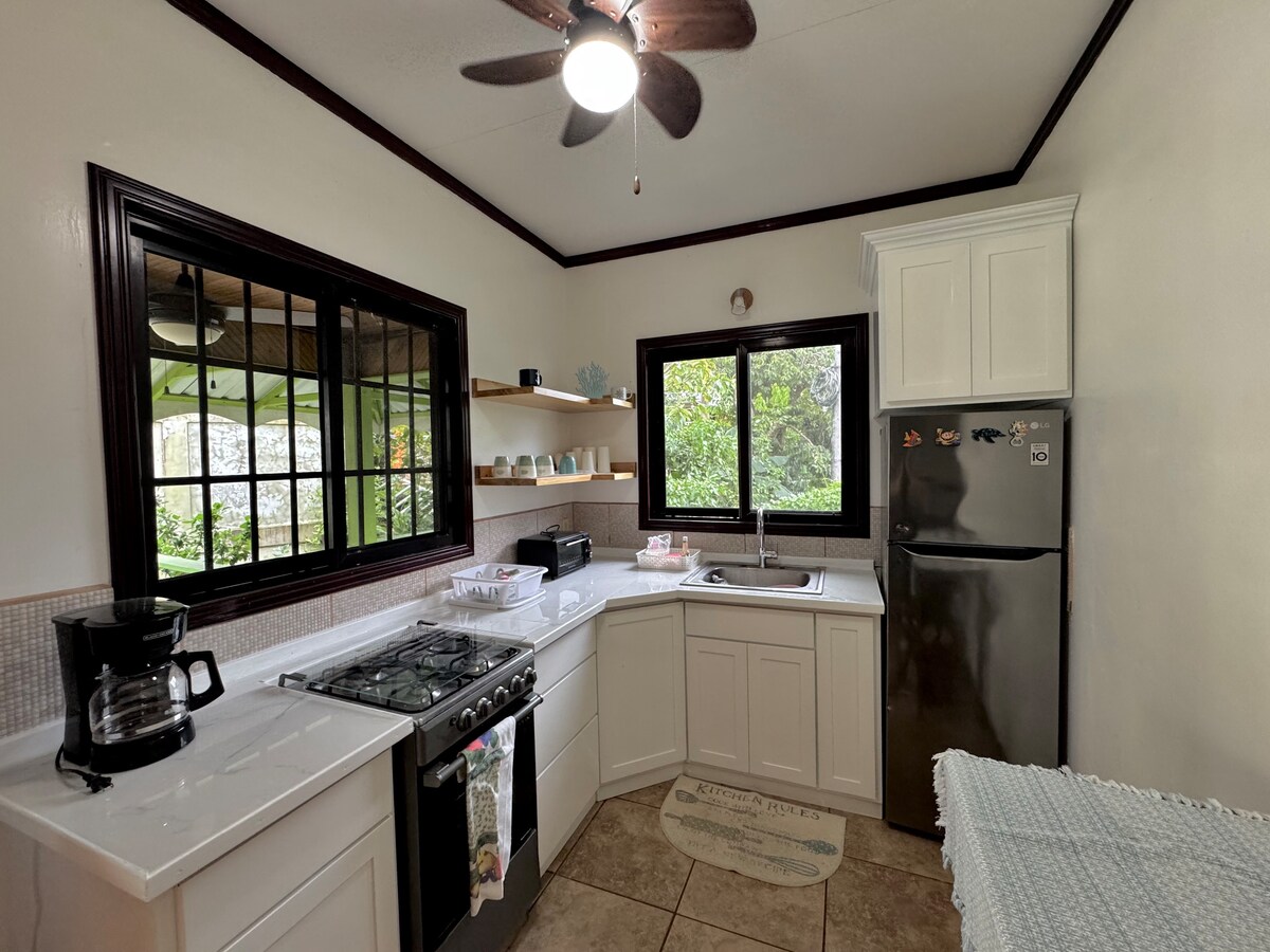 Relax and enjoy this unique and tranquil Tropical Island experience. Our Cabins are completely furnished with Hot water in shower, bath lavatory, and kitchen sink. Fully equipped kitchen with stove/oven, fridge, microwave, coffee pot, kettle, and more. In the living room there’s a very comfortable sectional sofa with coffee table, wifi and smart TV with cable channels. Enjoy the outdoor Palapa and BBQ pit for those special events. At the back of the cabin there’s an outdoor hot water shower.