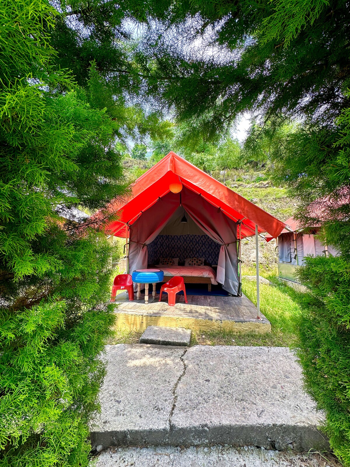 Our two thoughtfully designed tent houses offer a peaceful escape where nature, comfort, and mountain charm come together in the hills of Bir, Himachal Pradesh, . Each tent house is spacious, well-ventilated, provide stunning views of sunrises, drifting clouds, and star-filled nights. Inside, you’ll find cozy bedding, warm lighting, comfortable seating, and essential amenities that ensure a comfortable stay without taking away from the raw beauty of outdoor living.