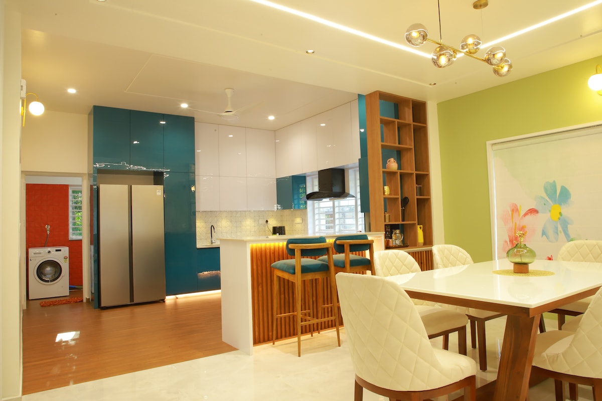 This stylish place to stay is perfect for trips with friends and family. Escape to the tranquil backwaters of Kerala and unwind in our stunning 3BHK villa, perfectly nestled in Thumpoly, Alappuzha. Our villa offers the perfect blend of comfort, luxury, and natural beauty. Strategically located near some of Alleppey's most stunning beaches - the famous Marari Beach at 9 km, Alleppey Beach at 2 km and Mangalam Beach. a secluded serene beach with calm waters at 1km, a 10 min by walk