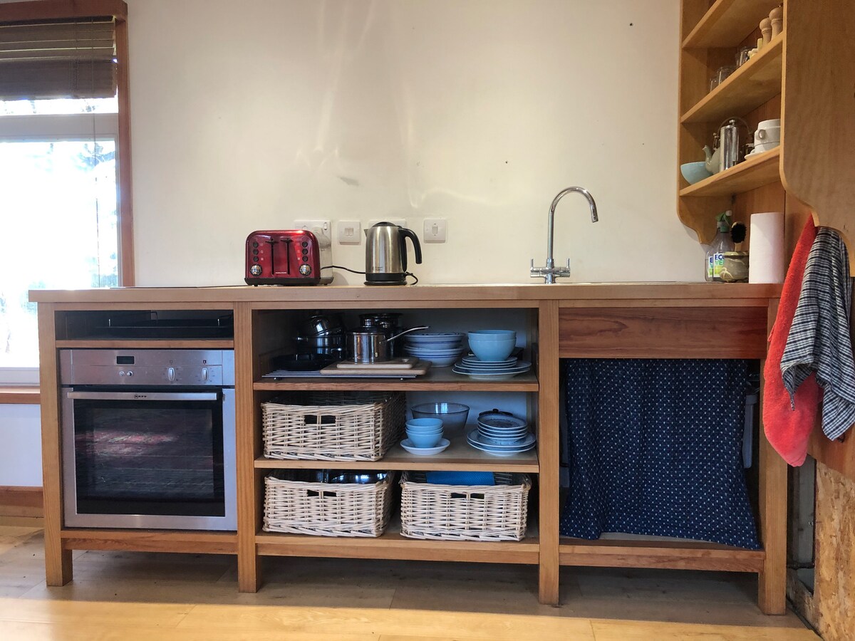 The unique Tin Shed has been designed using sustainable and recycled materials, featuring original art from local artists and filled with natural light. It is lined with wood creating a warm and natural ambiance and it also has a wood burner. A compact, well equipped kitchen, living space, ground floor bathroom with power shower and WC. Upstairs is a generous bedroom with Super king or twin beds, and beautiful views of rolling countryside from a picture window. Outside is a patio and fire pit.