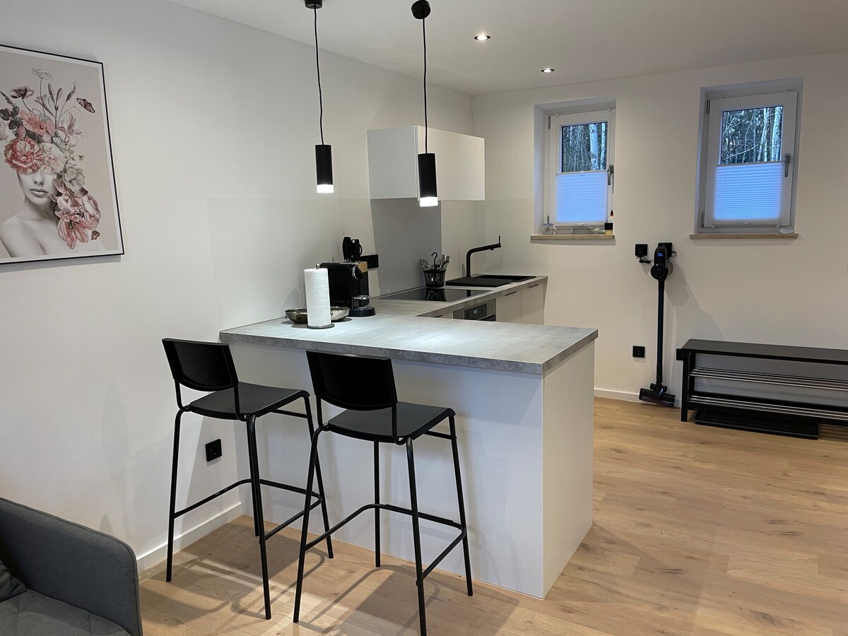 Idyllic apartment in a rural atmosphere surrounded by nature. The newly renovated apartment has a modern fitted kitchen, bedroom, bathroom and a stylish, open living/dining area. It is located in a small forest settlement and invites you to take wonderful walks. The accommodation has free WiFi and a parking space in front of the front door. This modern apartment offers everything your holiday heart desires. Enjoy your vacation in almost 30m2 of living space.