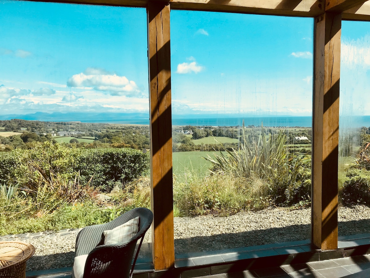 A quirky converted barn in stunning North Wales. Ideally placed for many activities, beaches, mountains, quaint villages,sport and more. With Super-fast WiFi. Comfortable rustic charm with modern conveniences plus 5 outdoor spaces to enjoy after a full day of sightseeing or just stay put in front of the fire. Surrounded by lush green countryside with great views across the fields to the hills and sky. Bring your telescope, bring your paints..Please read 'Other Details'. Prearrange pet.