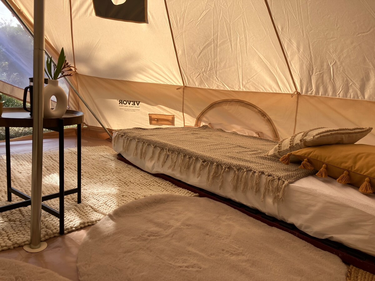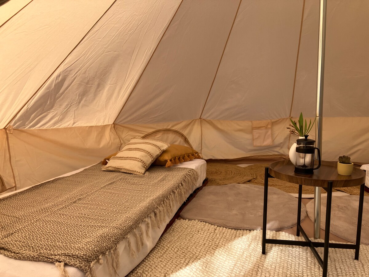 Tente cloche style yourte. Venez découvrir l'expérience Glamping tout confort en bénéficiant des services du camping à 50m de la plage. Couchage 2 personnes (2 matelas 80x200). Veuillez porter vos draps et sacs de couchage. (Option literie possible : 15 euro). Moustiquaire, verrous sur fermeture éclair, petit ameublement, espace salon intérieur et extérieur ombragé. Frigo commun, petite vaisselle et ustensiles disponibles. 3 logements similaires dans même zone si besoin