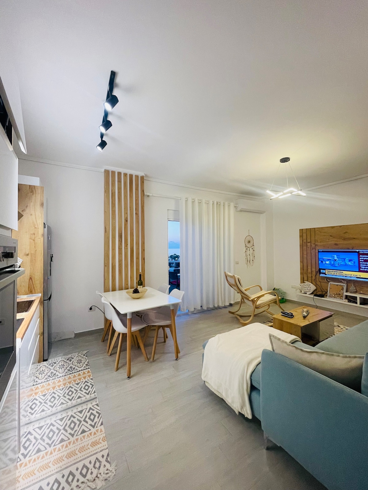 Bright Modern Apartment with Balcony Views | Golem offers a stylish 1-bedroom apartment for 4 guests, featuring a balcony, garden, full kitchen, air conditioning, Wi-Fi, dining area, and smart TV. Just 10 minutes walk from Golem Beach, enjoy a quiet seaside coastal spot near restaurants with private parking. Perfect for families and friends seeking a modern, relaxing coastal escape. Book now and start your unforgettable getaway!