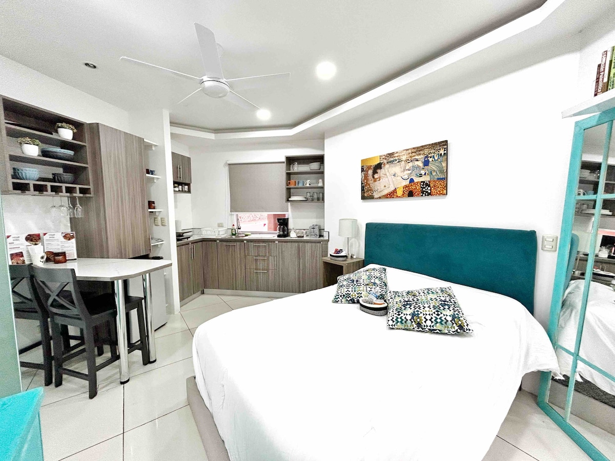 Kraliça çarpayısı və kondisioneri olan 35m² mənzil. Hospital San Karlosdan 300 m, El Encuentro Ticarət Mərkəzindən (Burger King, Metro, McDonald's, Papa John's, Pizza Hut, Taco Bell, Outlet və s.) 200 m məsafədə yerləşir. Supermarketlərə 300 m məsafədədir. Burada soyuducu, mətbəx, paltaryuyan, quruducu və bişirmək və işləmək üçün lazım olan hər şey var. Ayrıca 200/200 Mbit/s fiber optik İnternet. Təmizlik yalnız çatdırılmaya daxildir. Uzunmüddətli qonaqlar təmizlik işləri görür. Açarsız giriş, kod girişi.