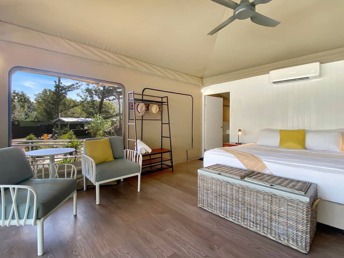 Bu Glamping Çadırı Ingenia Holidays Rivershore-da yerləşir Bu eksklüziv özünə məxsus Safai Kinq Çarpayı çadırlarında hamam otağı, mətbəxt və tərs dövrəli kondisioner sistemi olan rahat və komfortlu qonaqlama təmin etmək üçün lazım olan hər şey var. Seçim 10 yaşına qədər uşaqlar üçün uyğun olan 2 nəfərlik düşərgə çarpayısı daxildir. ** Bu Safari King Bed Glamping Çadırında ev heyvanlarına icazə verilmir **