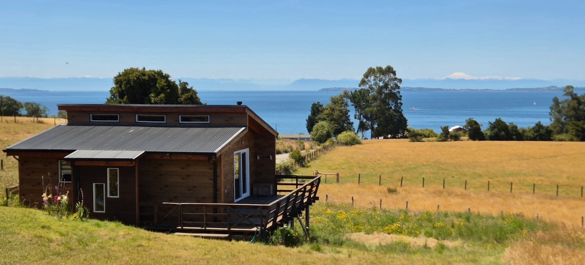 Escápate a este refugio autosustentable en Achao diseñado por Edward Rojas. Vistas al mar desde cada rincón y Hot Tub privado para el descanso total. Tu día aquí: remar en SUP, leer junto a la estufa a pellet, ver cine en el proyector o tocar guitarra junto a un fogón sin humo. Con WiFi, pequeño escritorio y fácil acceso: a 5 min del pueblo y 40 min del aeropuerto. Un entorno de paz, a 5 min caminando a la playa! Ideal para 2-3 personas que buscan volver su equilibrio en este entorno mágico.