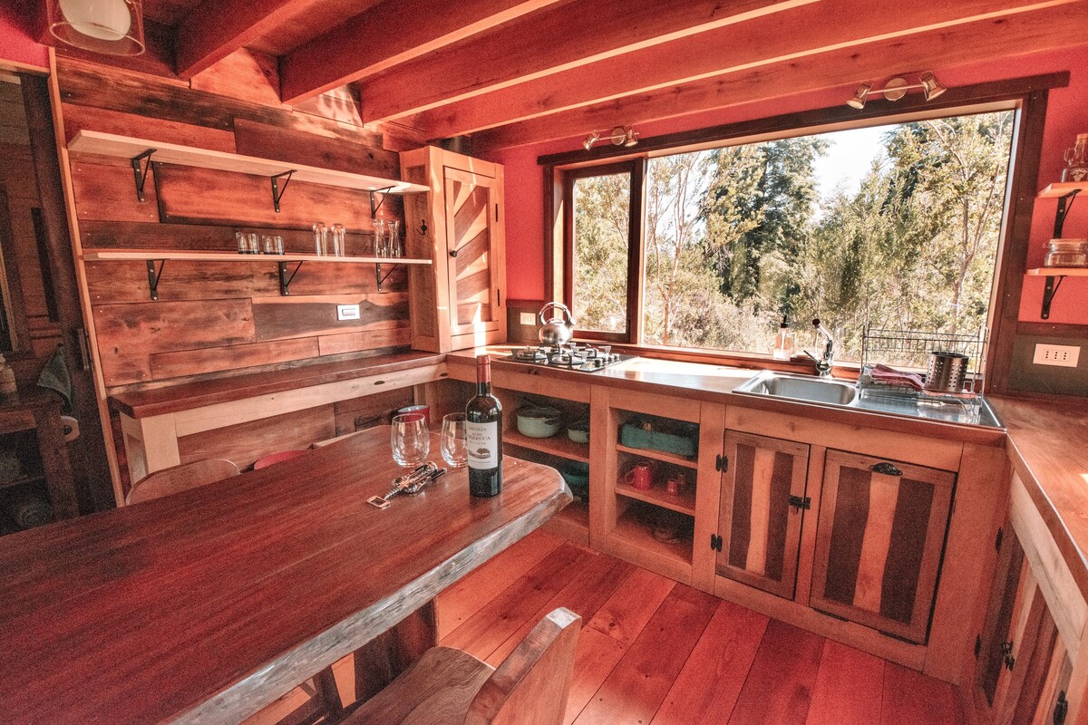 Nağılvari memarlığı ilə günəş enerjisi ilə işləyən kabinəmiz Ensenadanın yüksəkliklərində, Kalbuco vulkanının yamaclarında yerləşir. Turistlərə və səyahətçilərə yüksək keyfiyyətli, tam əllə hazırlanmış, qonaqlama təklif edirik. istirahət etmək və düşünmək üçün bir yer, istehlakçı cəmiyyətindən uzaqda. O, həm də müəyyən bir zaman üçün "vacibə geri dönmək" nələrin prioritetlərini yenidən düşünmək və sınamaq üçün ideal yerdir.