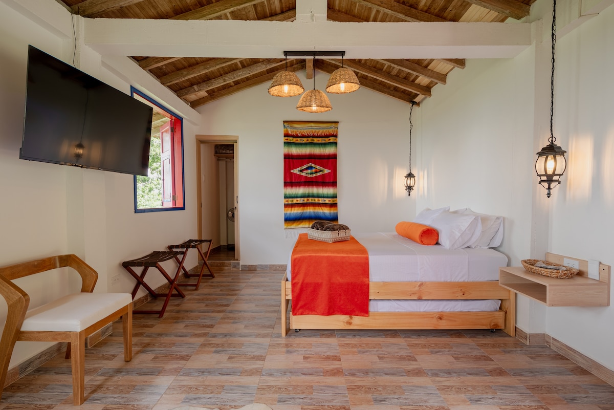 Quindío-nu araşdırmaq üçün mükəmməl yer olan Filandiya və Quimbaya arasında yerləşən bu eksklüziv FINCA-hoteldə unikal təcrübədən zövq alın. 6 nəfərə qədər yata bilər, rahatlıq və yaxınlıq axtaran ailələr və dost qrupları üçün əladır Əmlakda var: - 3 yataq otağı/2 hamam otağı olan əsas ev - Paylaşılan cakuzi (əvvəlcədən bron edilməlidir) - Yüksək sürətli internet - Uşaqlar üçün oyunlar - Səhər yeməyi daxildir, əlavə olaraq paylaşmaq üçün boş boşqablarımız var.