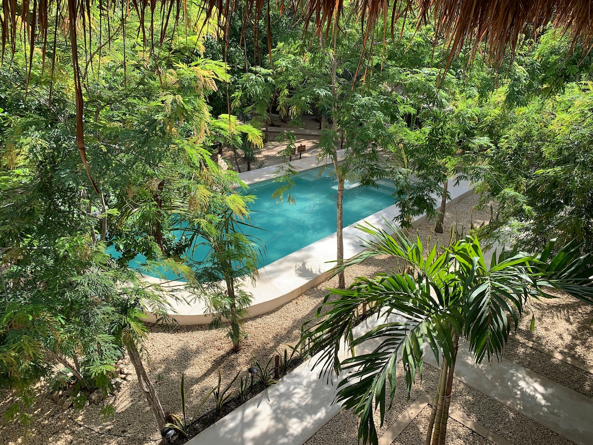 Tulum mərkəzinin yaxınlığında və möhtəşəm çimərlik və Tulum çimərlik klublarından cəmi bir neçə dəqiqəlik məsafədə hovuzlara birbaşa çıxışı olan heyrətamiz loft mənzil. Bir neçə heyrətamiz üzgüçülük hovuzu, dam üstü hovuz, günəş çarpayıları, gözəl idman zalı, 24/7 işçi heyəti, güclü A/C, lift, sürətli Wifi (400 Mbit/s), qaralma pərdələri, 55" ağıllı televizor, tam təchiz olunmuş mətbəx və şəxsi parkinqdən zövq alın. Damüstü restoranda açıq havada yemək yeyin və ya sadəcə gözəl panoramik mənzərələrlə içki için