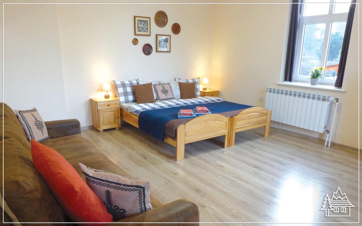 Samodzielne, w pełni niezależne mieszkanie, które stanowi odrębną część pięknego, wykonanego w góralskim stylu domu. Apartament posiada własne niezależne wejście. Zaraz po wejściu jest oddzielne pomieszczenie, w którym można zostawić kurtki, buty, sprzęt narciarski itp. Następnie przedpokój z aneksem kuchennym oraz dużą zabudowaną szafą z miejscem min. na ubrania i walizki. Sercem mieszkania jest przytulny salon z kominkiem pełniący również funkcje sypialni. Apartament posiada własną łazienkę.