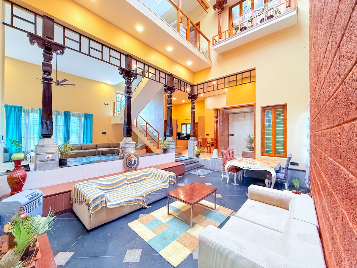 The best thoughts and encounters occur at places where you feel you are lost to nature. This unique place has blooming flower garden in front and back, see through glasses to view full moon on full moon day, art filled walls, sky Gazing glass roof, king size bed to roll over, traditional kitchen stocked with groceries and spices to cook, work station with wifi and bathing. 15 to 30 minutes drive to Indiranagar, MGRoad, Whitefield, Outer Ring Road IT hubs & Phenix mall & to KR Puram metro rail.