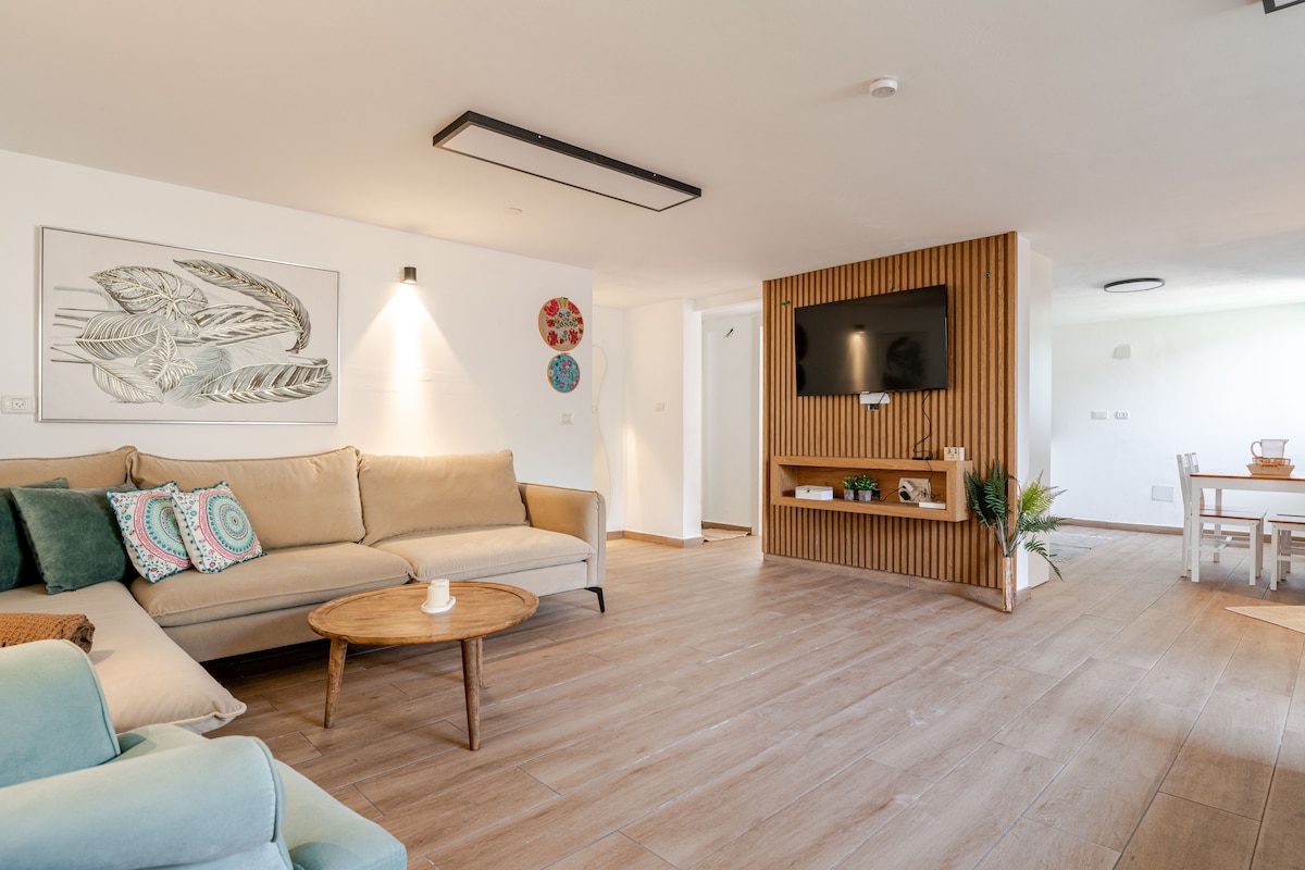Butik B&B kimi dizayn edilmiş geniş vahid. Qonaq otağında gözəl, əlavə hündür taxta tavan, Zippori axınına baxan gözəl 50 kvadratmetrlik perqola mənzərəli terras var. Mənzil yaşayış səviyyəmizdən yuxarıda yerləşir və ayrıca avtomobil yolu və girişi var. Mənzil əlçatanlıq bölməsində göstərilən təfərrüatlara uyğun olaraq airb&b standartları ilə əlillər üçün əlçatandır. Bütün otaqlarda kondisioner var. Bütöv Yataq və Səhər Yeməyində maksimum qonaq sayı 5 + 1 körpə # 1 Yataq otağı İkimərtəbəli çarpayı Birnəfərlik çarpay Beşik əlavə etmək üçün seçim # 2 Yataq otağı Qonaqların seçməsi üçün 3 seçim var, onları fotolarda görə bilərsiniz: 2 nəfərlik çarpayı İkimərtəbəli çarpayı Birnəfərlik çarpay
