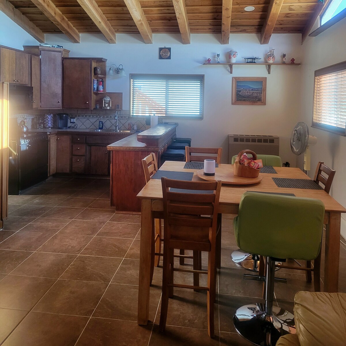 Bu Yer kürəsi sagebrush və chamisa ilə əhatə olunmuş sakit, sakit, romantik, özəl, (bir akrlıq çox yer) bir ev yaşamaq üçün əladır və şəhərdən cəmi 15 dəqiqəlik məsafədədir. İçərisi qızıl saman, bayraq daşı döşəmələri və köntöy Sycamore Palıd şüaları ilə qaranlıq adobe. 3 kivas buxarı da! Bura səsyazma studiyası kimi də istifadə olunub. Möhtəşəm fotoşəkillər çəkməyi xoşlayırsınızsa, bura yerdir. Rahat, komfortlu! Ev heyvanları qonaq qəbul edə bilər və kirlənməlidir! Pişik qutusu sorğu ilə təmin edilir.