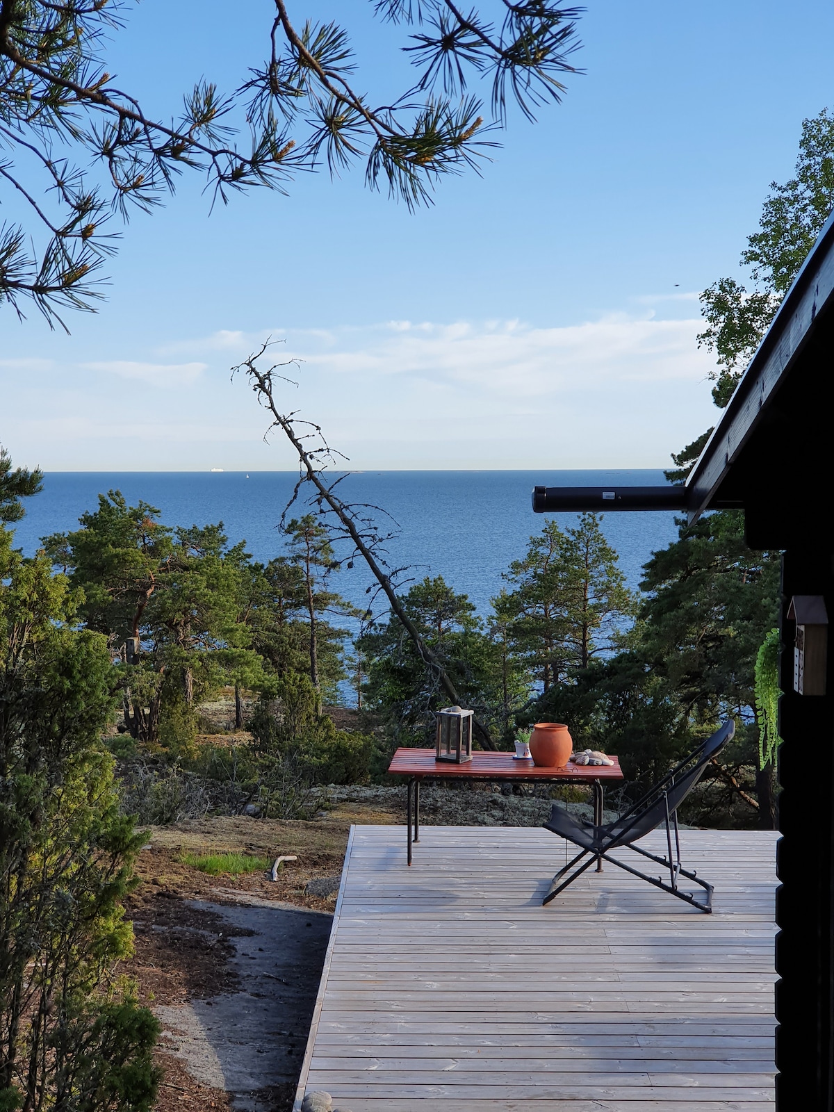 Mənzil təbiətin ortasında, dənizin düz yanında sakit bir yerdə yerləşir. Geniş mənzil yenicə təmir olunub və yaxşı təchiz olunub. Böyük terrasda yemək, istirahət və istirahət üçün imkanlar var. Terras ərazisində manqal, günəş şezlonqları, sauna və cakuzi var. Terrasdan uzun planlar meşədən keçərək od çuxuru, arıq-tos, dok və sıra qayası olan qayalı çimərliyə qədər uzanır. Həyətdə toyuq və balalarımız, eləcə də tramplin və həyət oyunlarımız var.