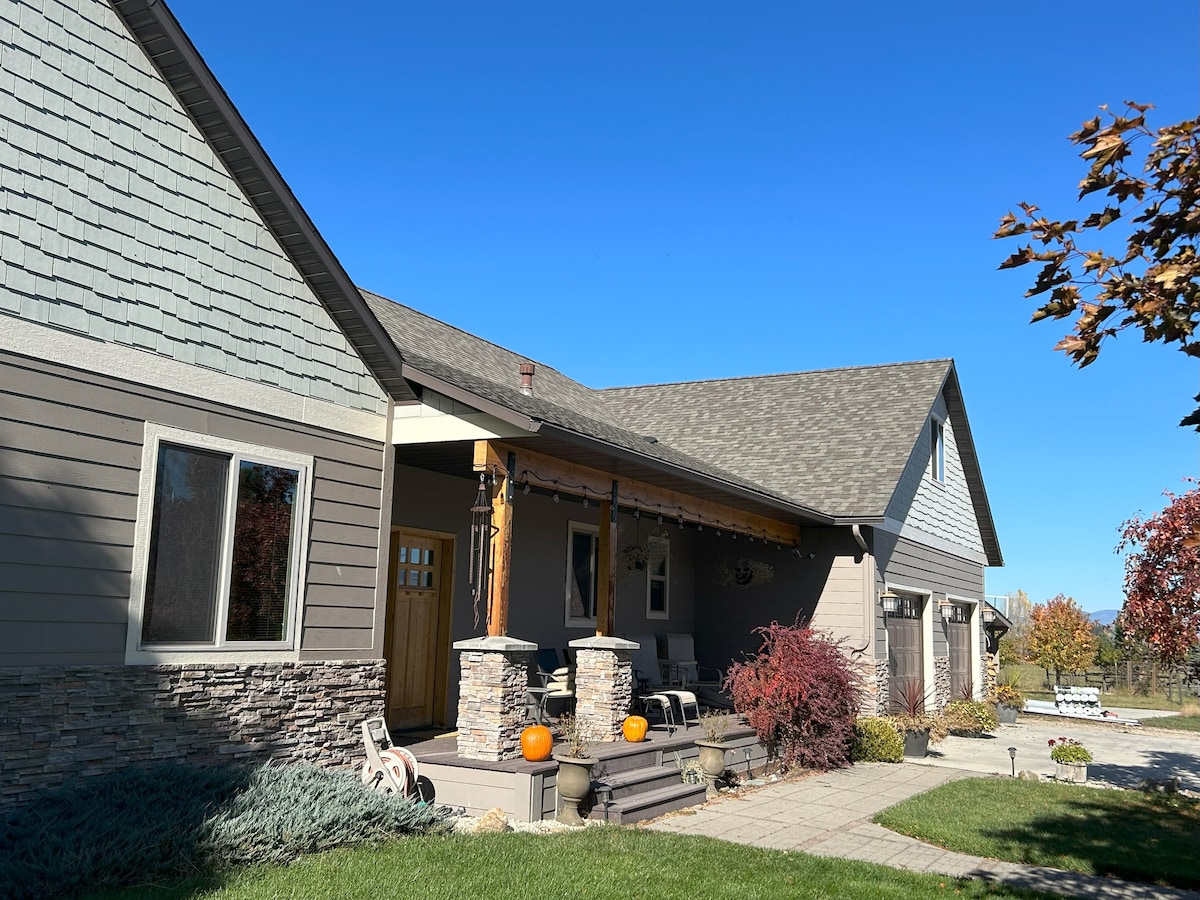 Payız gəldi və sizi Qərbi Montanadakı gözəl Bitterroot Vadisindəki evimizdə qarşılayırıq. Bu ev dizaynı ağacdan hörülmüş elementləri və həyəti olan Bitterroot Vadisi və Səhra Cənub-Qərbinin qarışığıdır. Tarixi Stivensvildən cəmi 3 mil şimalda və şərqdə yerləşir. Otağınızda gözəl Bitterroot dağlarının komandanlıq mənzərəsi var. Ev kodlu darvaza girişi olan 2,8 hasarlanmış ərazidə qurulub. Qızıl retrieverimiz Rudi çox güman ki, ilk salamlayan şəxs olacaq.