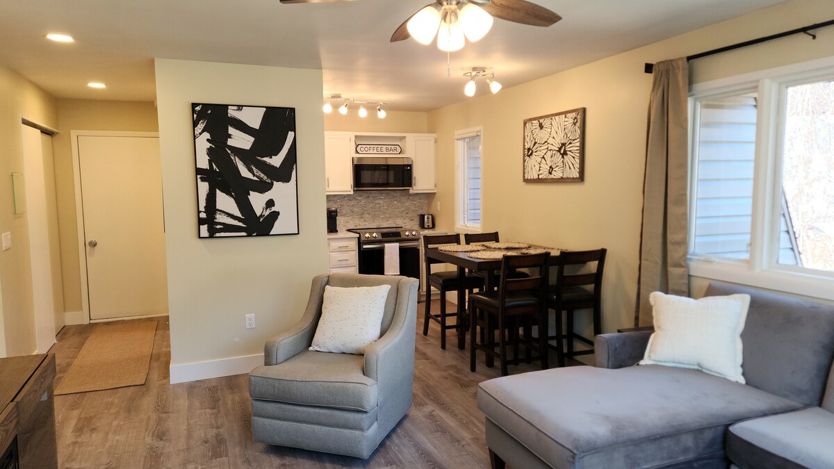 1 bedroom 1930's guest cottage with a living room. Near many hiking trails. Window air conditioner brand new, ceiling fans in living room and bedroom. Separate windowed bedroom with new full size mattress. Full size gas stove, microwave, fridge, Keurig coffee maker, toaster and large tiled counter and sink. Full bath off bedroom with large clawfoot tub and shower combination and sink and brand new toilet. Wifi , flat screen Smart TV. Vintage cast iron fireplace with electric insert.