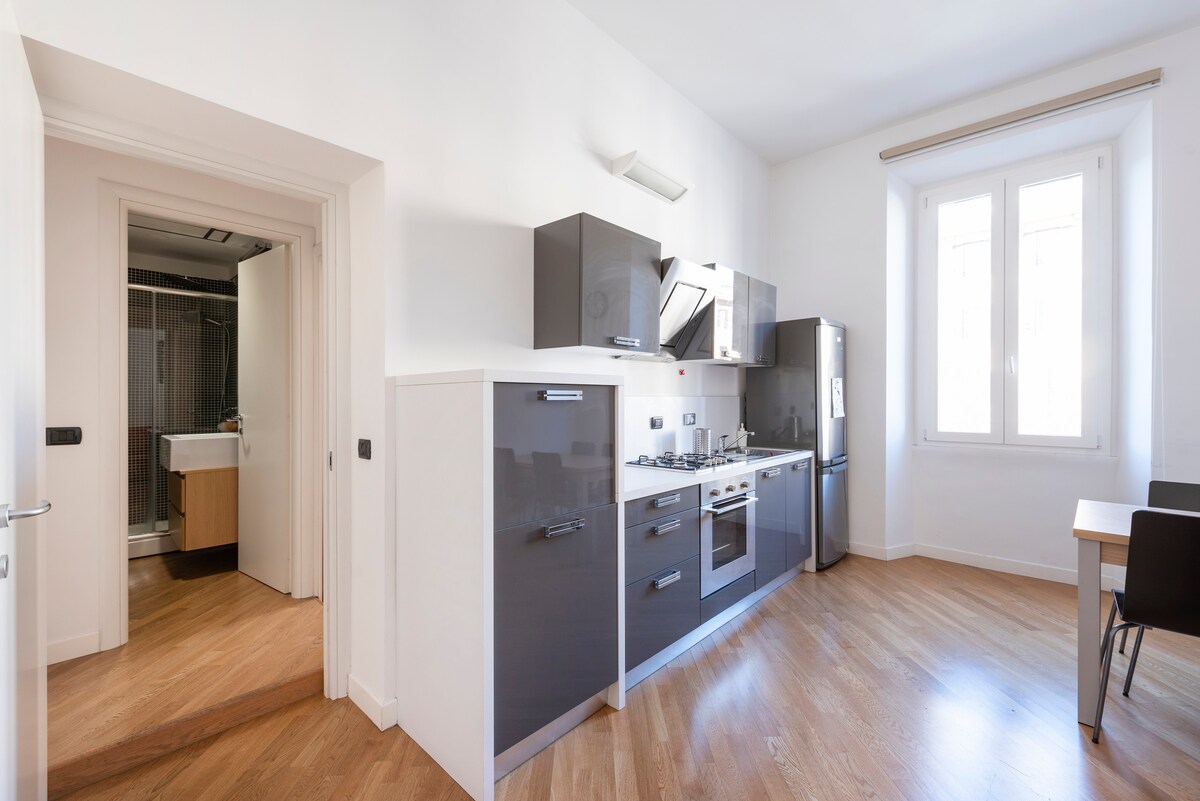 Rahat mənzilimizdə rahatlıq və müasirliyin mahiyyətini kəşf edin. Ayrıca terrasda və ya geniş duşu olan dəbli hamam otağında dincəlin, tam təchiz olunmuş mətbəx isə ehtiyaclarınıza cavab verir. Re di Roma Metro Stansiyasının A xəttindən cəmi 3 dəqiqəlik, C xəttindən, avtobus və tramvaylardan isə 7 dəqiqəlik məsafədə hər bir maraq nöqtəsinə asanlıqla çatacaqsınız. Qonaqlamanızı indi bron edin və Romada unikal təcrübədən zövq alın!
