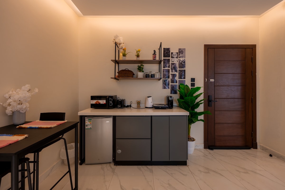 Modern designed penthouse apartment, located in the heart of Jeddah. - The penthouse apartment is located 2 minutes away from Prince Sultan, 4 minutes away from U-Walk Mall. - This modern designed penthouse apartment will meet all your holiday needs. - The apartment offers a fully furnished room, living room area, kitchenette, and bathroom. - The apartment has the essentials of a holiday such as a 70-inch TV, 5G internet, refrigerator, coffee machine, and more.
