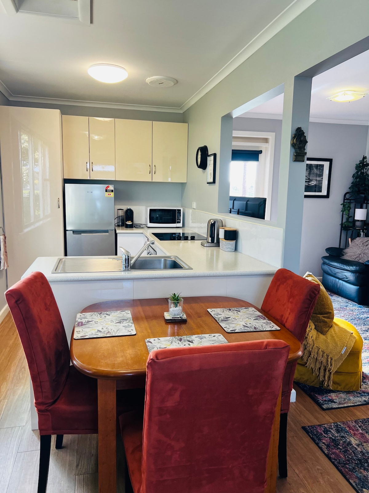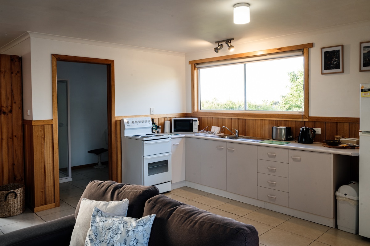 Ivys by the beach . Modern well appointed, clean and cosy, WIFI. This one bedroom home offers a comfy Queen bed plus a sofa bed in the lounge area for extra quests. Full cooking facilities, sofa bed and a short walk to historic town centre and restaurants. The convenience of washer and dryer, plus excellent heating and cooling. Relax on the deck overlooking lush farmland and with views across to Highfield. From the front door you can view The Nut and a short walk to the beaches .