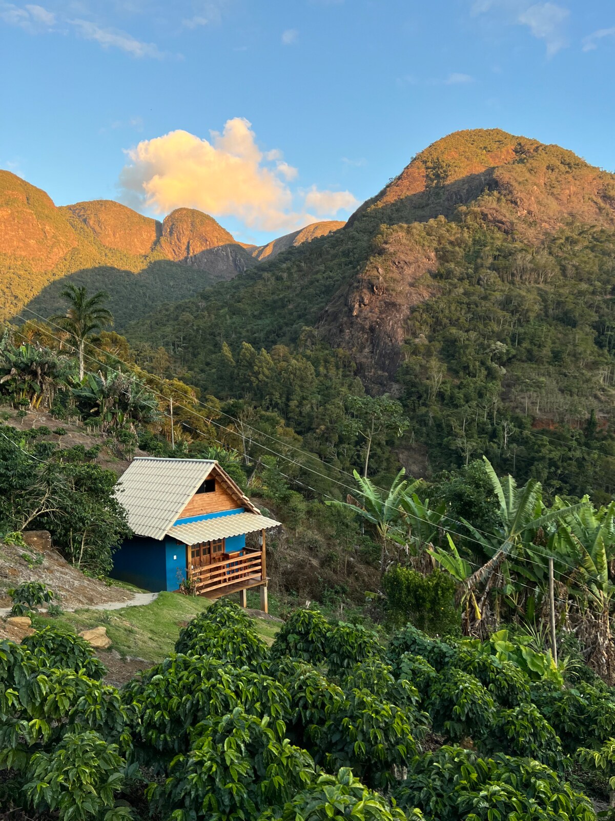 This is a beautiful property in ALTO CAPARAÓ, MG known as the coffee city of Brazil. A little piece of heaven, this cozy cabin is located in the middle of 800 coffee trees. Beautiful sunset view, a private path surrounded by fruit trees, and even a natural spring you can drink from directly! This private oasis is perfect for a romantic getaway after hiking the Pico da Bandeira, visiting coffee farms, or just enjoying the countryside. Only 5 min from Alto Caparao square. Come see for yourself!