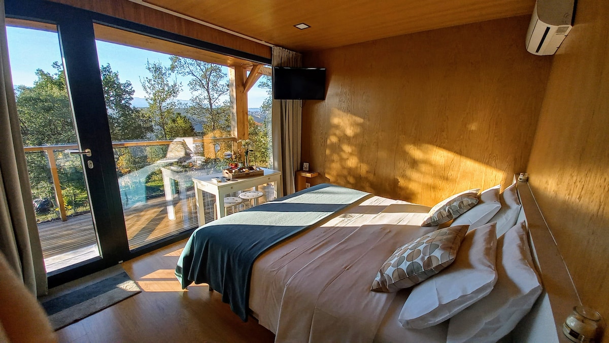 Ətraf mühitə amplitud bəxş edən panoramik pəncərələrlə təbii işığın və heyrətamiz mənzərələrin girişinə imkan verir. Burada qonaq otağı, tam təchiz olunmuş yemək sahəsi, geniş və duş kabinəsi olan müstəqil yataq otağı, yataq otağında hamam otağı və açıq hava platformasında cakuzi SPA var. Dağda və üzüm bağları və meşələrlə əhatə olunmuş villalar Monte dos Xistos Quimarães şəhərinin tarixi mərkəzindən 10 km məsafədə yerləşən mövqedən zövq alın
