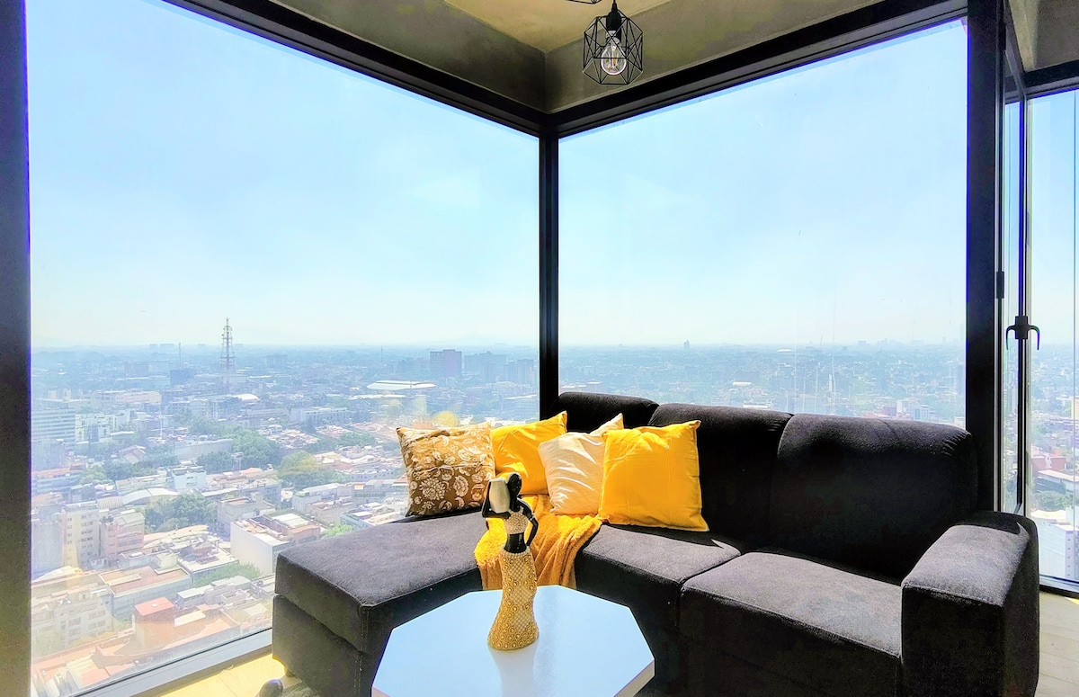 Mərkəzdə yerləşən Paseo de la Reformanı heyran edən və İnqilab Abidəsinin möhtəşəm mənzərəsi olan bu evdə dəbli təcrübədən zövq alın. Mənzildə bütün imkanlar, eləcə də səfərinizdə zövq ala biləcəyiniz imkanlar var (hovuz, cakuzi, kardio sahəsi olan gimnaziya, fırlatma və çəkilər, SPA, birgə iş və restoran). Tarixi mərkəzdən cəmi 10 dəq, Polankodan 20 dəq., Qvadalupa Bazilikasından 25 dəq., Teotihuakan piramidalarından 1 saat.