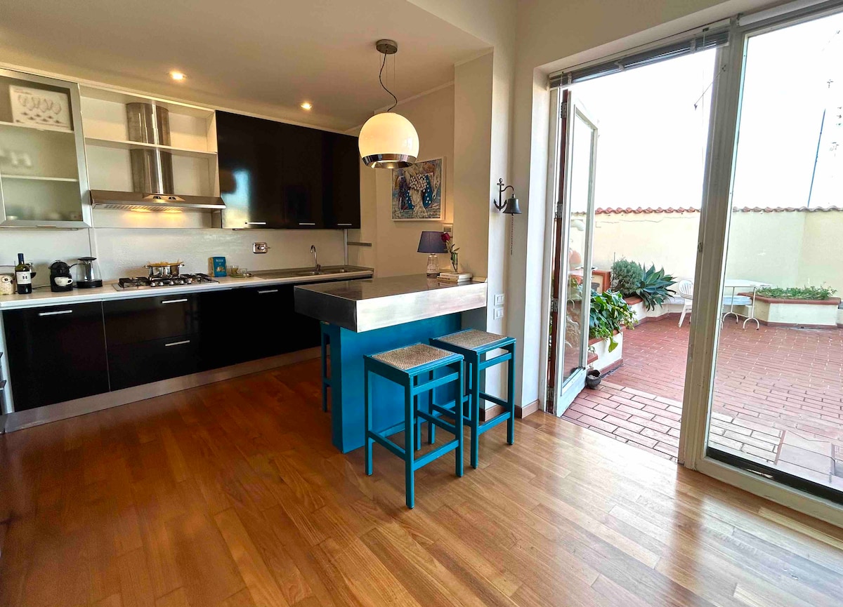 Il nostro splendido attico con 70 m2 di terrazzo al centro della città a pochi passi dal corso principale e dalla spiaggia. Può ospitare comodamente quattro persone, dispone di una buona illuminazione naturale. 400 metri dal mare a 300 metri dal corso principale dello shopping a 900 metri dal Museo Archeologico Nazionale a 400 metri dal Castello, a pochi metri Supermercato e Farmacia. C’è la possibilità di parcheggiare comodamente sulla strada proprio vicino alla struttura.