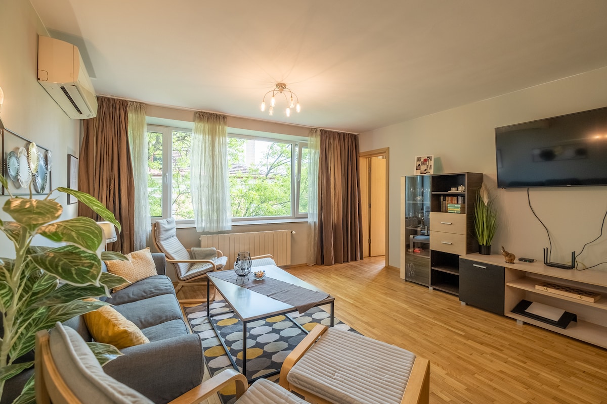 Sofiyanın tarixi mərkəzində yerləşən bu sakit, romantik mənzildə özünüzü evinizdəki kimi hiss edəcəksiniz. İşıqlı və Vitoşa Dağı mənzərələri ilə dolu olan bu yer Kafedral, Bazar Zalı və Vitoşa Bulvarı kimi görməli yerlərdən piyada məsafəsindədir. Cütlüklər, tək səyahətçilər və ya uzaqdan işləyənlər üçün mükəmməl olan bu məkan keyfiyyətli yataq dəsti, sürətli Wi-Fi, tam təchiz olunmuş mətbəx və dincəlməyə dəvət edən kitablar ilə düşünülmüş şəkildə dizayn edilib.