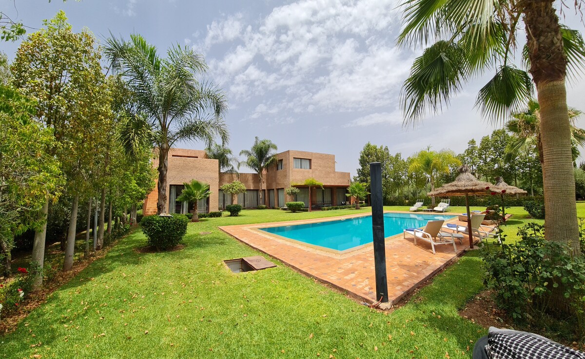 Marakeşdən Fezə yolunda 20 km məsafədə yerləşən fermada hovuz və sürüşkən villa. Tranquility və dekorasiya dəyişikliyi əmindir. 3000 m2-lik gözəl bağ və qazon, yelləncək və voleybol torları olan əsl park. Slayd, əsl zövq və bütün yaşlar üçün əla hiss olan böyük hovuz. Yaxşı qarşılama və təhlükəsizlik. Fermadan qab-qacaq və məhsullar sifariş etmək imkanı, bal ... Bu icarə yalnız ailələr üçün nəzərdə tutulub.