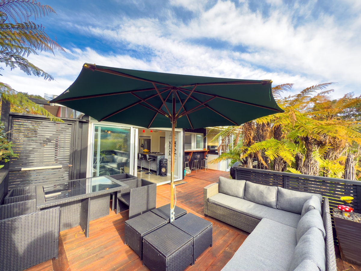 Dincəlmək və dincəlmək üçün yer axtarırsınız? Hər şey buradadır. Yerli ağaclar, füsunkar quş həyatı və dincəlmək və zövq almaq üçün göyərtə ilə əhatə olunub. Özünə xidmət əsasında səhər yeməyi təmin edilir: donuz ətindən hazırlanmış pastırma, yumurta, səhər yeməyi taxılları, qəhvə, tost, yoqurt və meyvə. Qonaq evi tamamilə öz-özünə kifayət edir, öz işinizlə məşğul olmaq istəsəniz, barbekü də var. Hər şey sizdən asılıdır. Günəşli Kapiti Sahilinin nə təklif etdiyini kəşf edin. Gecikməyin – bu gün bron edin!