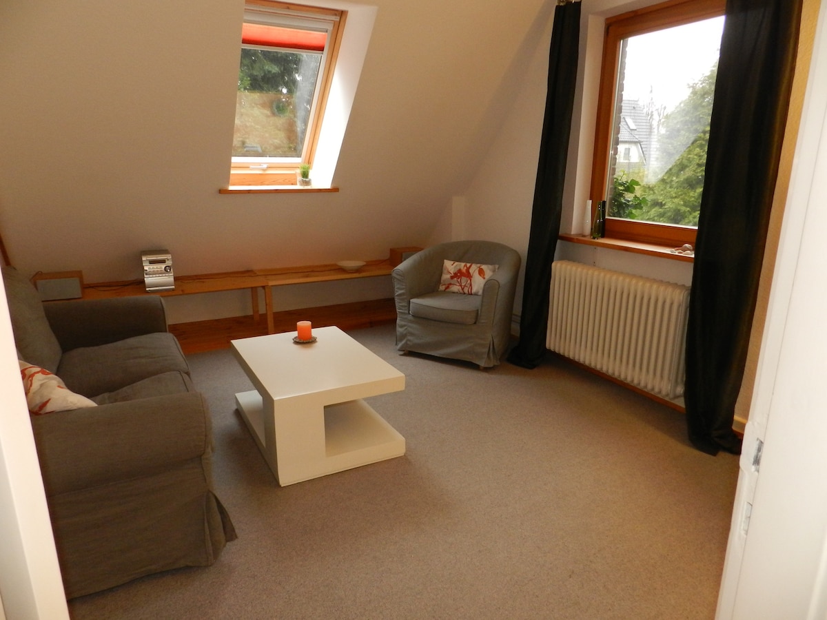 Qonaqlamam cütlüklər, tək macərapərəstlər və işgüzar səyahətçilər üçün əlverişlidir. Ayrıca girişi, eləcə də ayrıca duş otağı və anbar mətbəxi olan fərdi evdə mərkəzi və sakit şəkildə yerləşən işıqlı Paterre mənzili. Otağa 140 x 200 çarpayı, 2 kreslo və dolab daxildir. Sadə və sürətli yeməklər üçün anbar mətbəxi mikrodalğalı soba, qəhvə maşını, çaydan, toster, soyuducu, qablar və paltaryuyan maşınla tam təchiz olunub. Bağ oturma sahəsi mebel ilə təchiz olunub