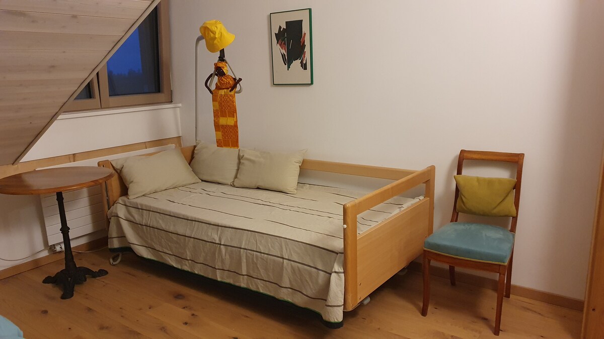 Vue-des-Alpesdən 15 dəqiqəlik məsafədə yerləşən bu səxavətli və işıqlı məkan kiçik qrupları və ya ailələri qarşılamaqdan məmnun olacaq. Alp dağlarına baxan çoxməqsədli qonaq otağı kurslar, seminarlar və ya ailə şənlikləri (tutumu 40 nəfər) təşkil etməyə imkan verir. Mebeli ilə boş qalan o, təxminən 10 nəfərlə Yoqa kimi daha çox meditativ fəaliyyətlərə imkan verir. Musiqi fəaliyyətləri üçün pianino qonaqlar üçün əlçatandır.