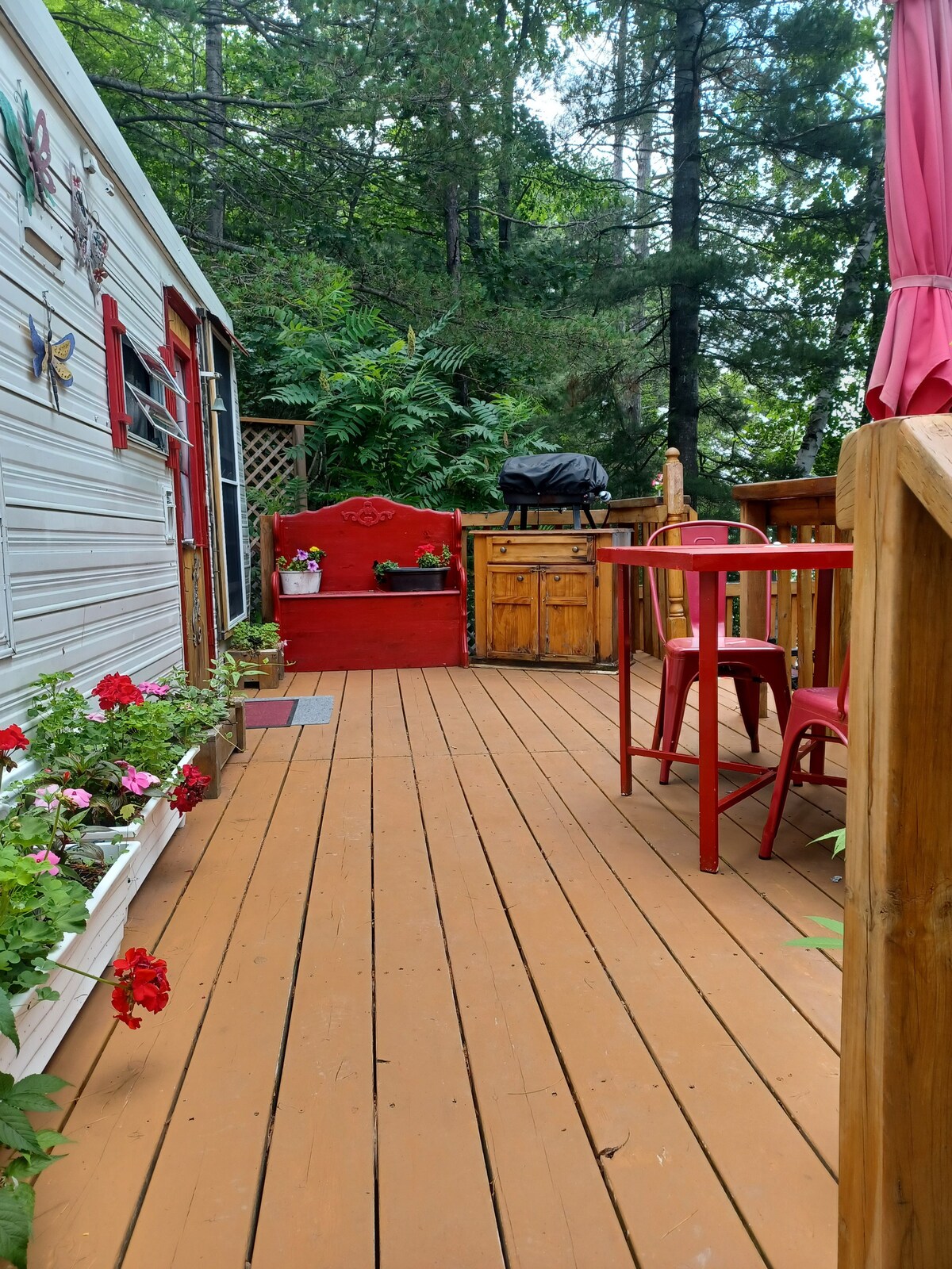 Total privacy & country comfort in the heart of the Ottawa Valley. A wonderful nature filled experience on the Bonnechere River, with private waterfront & outdoor campfire. Your glamper is solar & propane powered, very eco friendly! Lots of extras you need bring only your smiles, food and personal items! Fishing is good right off shore of your Glamper.