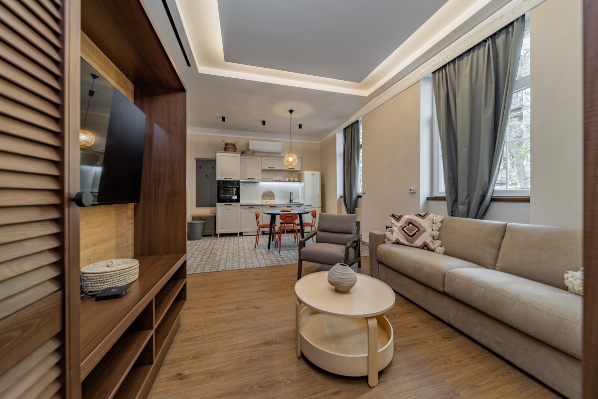 Mənzil bir neçə ay əvvəl tam təmir olunub və hər şey yenidir. Yataq otağında böyük rahat ikinəfərlik çarpayı və qonaq otağında bir böyük divan var. Hamısı təmkinli LED işıqda. Mətbəxdə müasir düz ekranlı ocaq, soba, dondurucu, qabyuyan maşın və paltaryuyan maşın və böyük bar masasından istifadə edə bilərsiniz. Hamam mərmər keramika ilə şüşələnib, çox yığcam və təmizdir. Hamam fen, dəsmallar, gigiyena dəstləri ilə təchiz olunub.