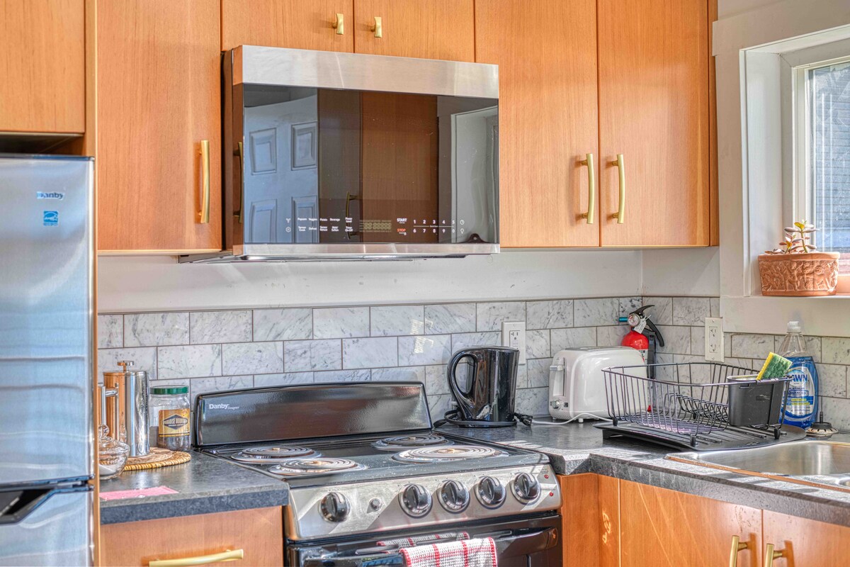 This is a brand new one bedroom apartment. You will feel renewed and rested in this quiet neighborhood "coach house". Come and go as you please with a completely private entrance. This Scandinavian style apartment features a beautiful 4 piece bathroom, kitchen (stove/microwave/fridge etc.), dining area, and lots of natural light. The apartment is fully air conditioned for the summer months. The space is very private and within walking distance of downtown.