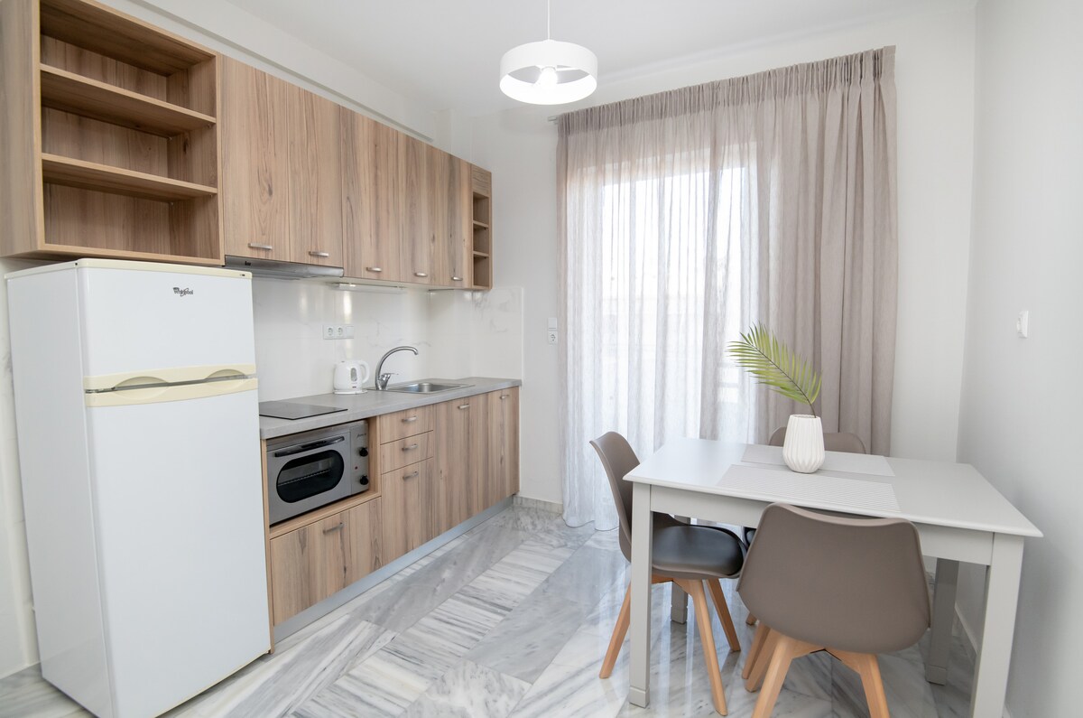 Bu, ada üslubunda, mavi və ağ, Dənizin mavi rəngi və dalğaların ağ köpüyü (hər otaqdakı müxtəlif dekorasiyalar, onları unikal edir və sizə xilas etmək hissi verir) ilə dəniz mənzərəsinə sahib mətbəx, WC, balkon və ya veranda ilə bəzədilmiş gözəl bir mənzildir. Kompleks iki çimərlik arasındadır: Lygaria sakit çimərliyi və kosmopolit Agia Pelagia çimərliyi Kazantzakis hava limanından avtomobillə 16 dəq, Heraklio limanından(Santorini, Pereus arrival-depart) 18 dəq məsafədəyik!