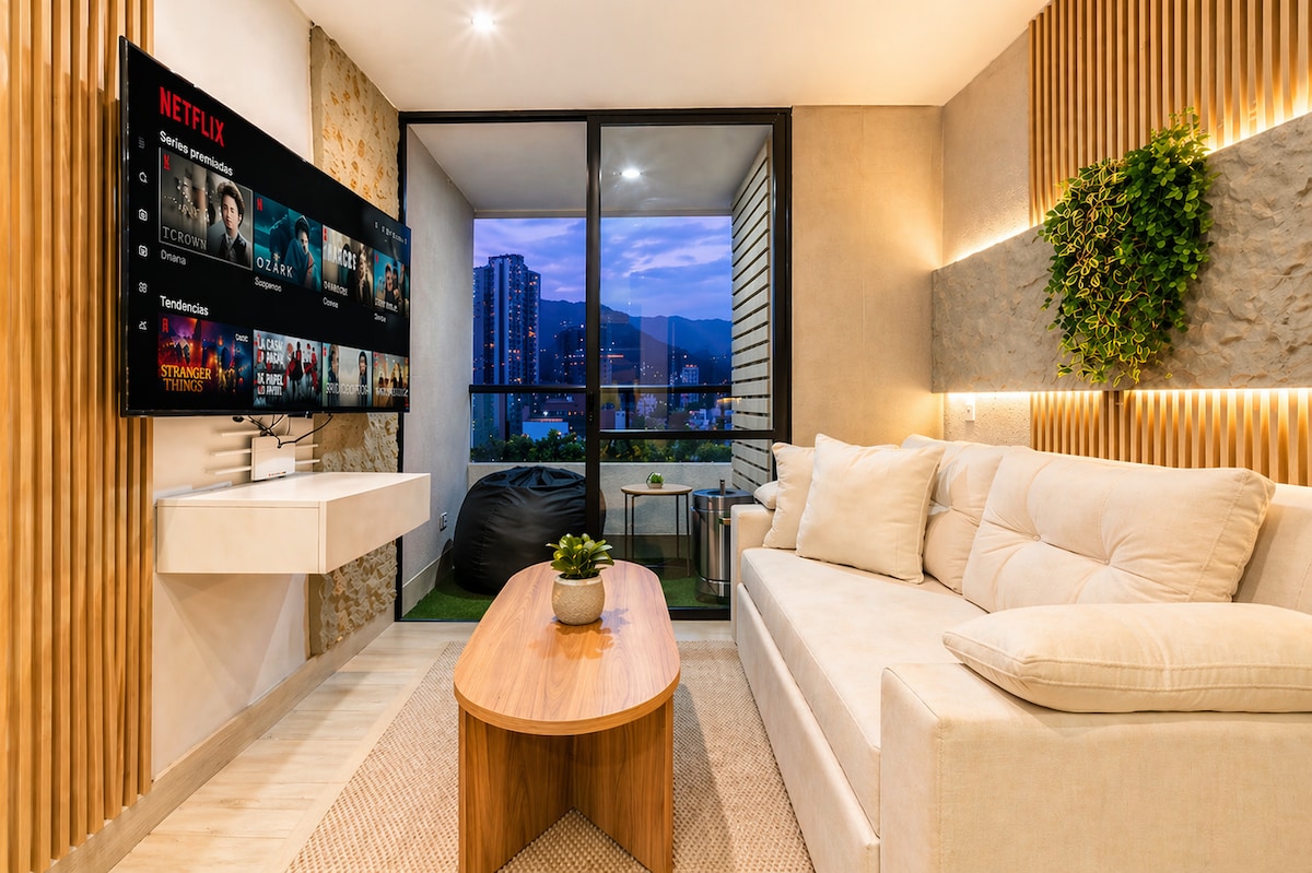 Özəl jakuzi, panoramik siluet və dağ mənzərəsi olan Premium 21-ci mərtəbəli El Poblado mənzili. Eyvanınızda dincəlin, kondisioner ilə rahat qalın, yüksək sürətli Wi-Fi və xüsusi iş sahəsi ilə işləyin və Netflix, tam təchiz olunmuş mətbəx, paltaryuyan/kurutma maşını və çay/qəhvə stansiyası ilə 3 HD televizordan zövq alın. Spa, idman zalı, buxar otağı, hovuz, restoran və kafeteryaya giriş imkanı. Parques Lleras və Provenza kimi lüks, dəbli və rahat yüksək mərtəbəli məkanlara qısa sürücülük məsafəsindəsiniz.