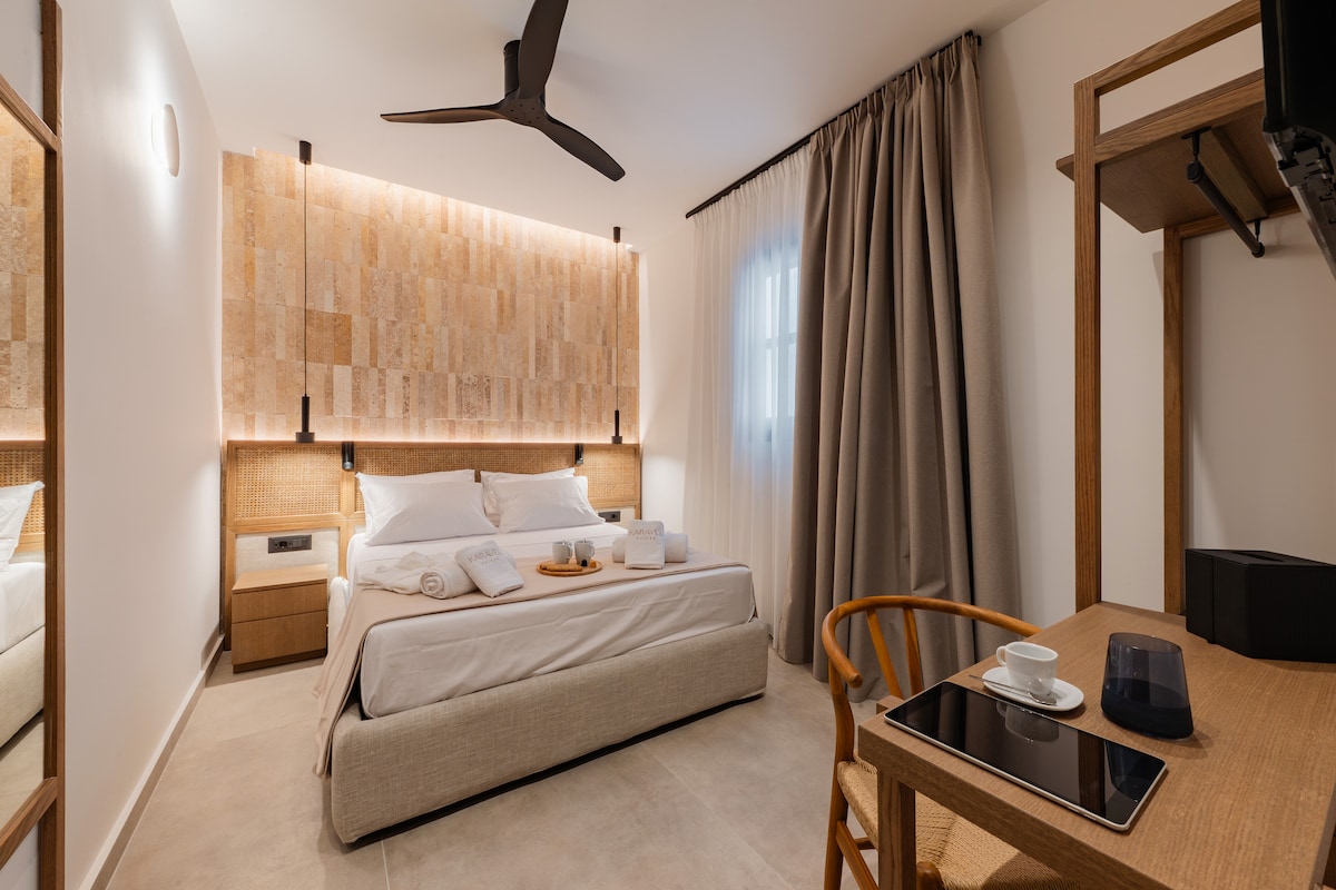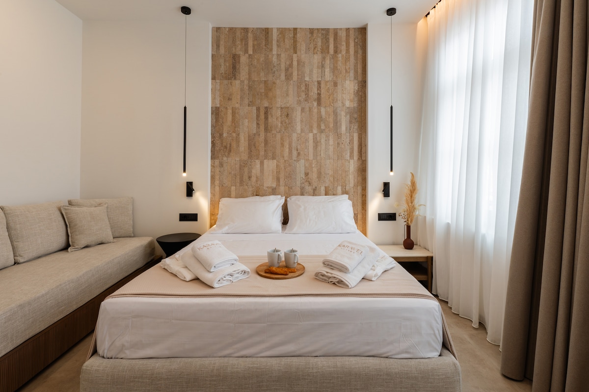 A bright, newly designed suite in the heart of Rhodes Old Town, offering a little extra space and a convenient kitchenette for a relaxed and comfortable stay. Surrounded by the charm of the medieval city and close to the port, it blends warm neutrals, soft textures, premium Cocomat bedding and elegant design details. Ideal for couples seeking comfort, privacy and a calm boutique feel, it offers a refined base for exploring the Old Town on foot.