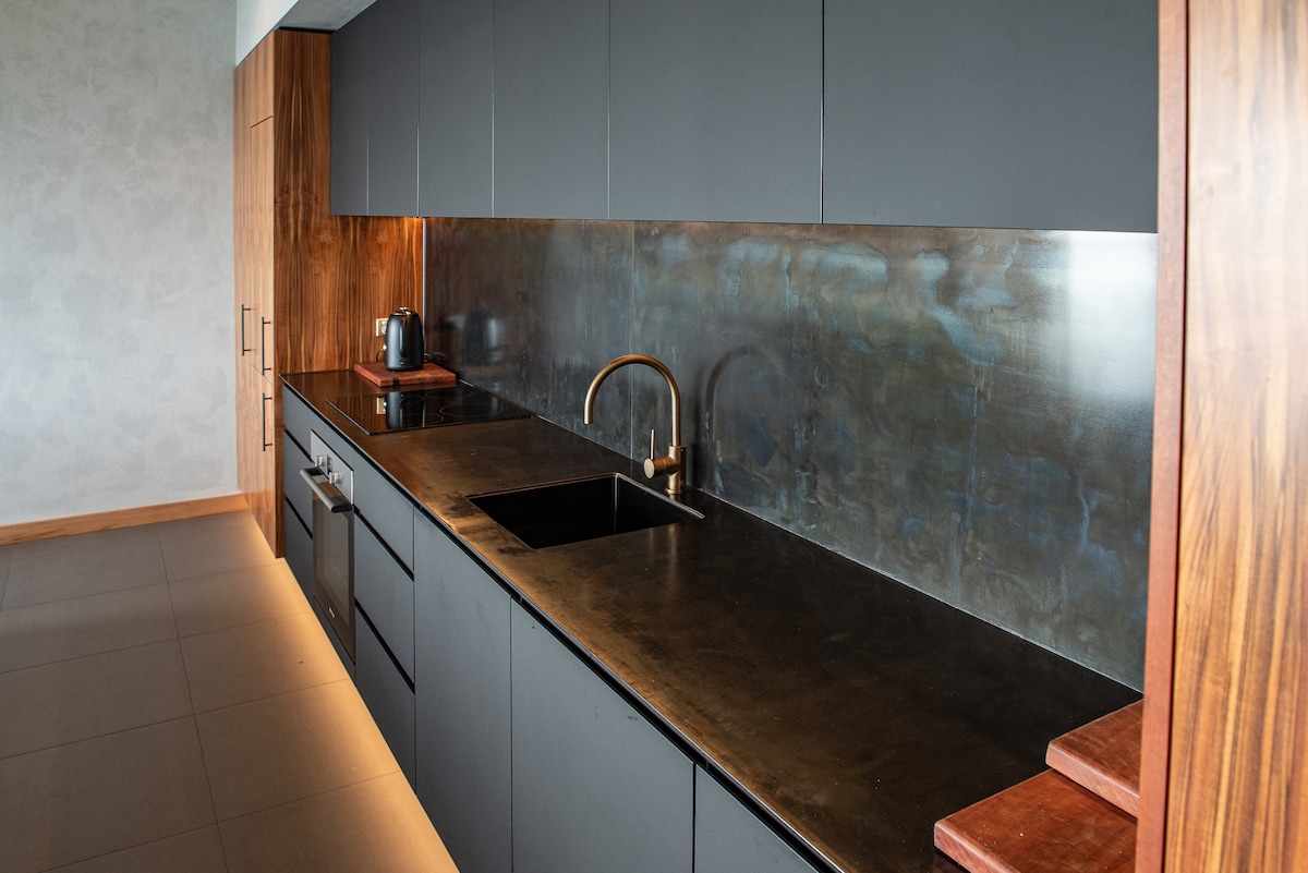 Felons Corner by Van Diemen Rise. 90 acres of dark forest, lofty views and rolling meadows overshadowed by a brooding mountain-scape. Out of the tree-line, a boutique cabin is worked into the fabric of the wilderness and walks the dangerous divide between hunting hideaway, industrial chic and unapologetic luxury. Follow the story @vandiemenrise This listing is not suitable for young children or pets due to the delicate nature of the furnishings