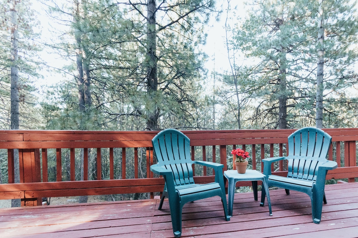 Escape to our rustic, romantic cabin featuring vaulted ceilings, original paneling, and a wood-burning fireplace. The fully outfitted kitchen has everything you need. Step directly into the National Forest from the backyard, or relax on the front deck with your morning coffee or evening wine. Enjoy fast Wi-Fi (114.2/11.3 Mbps), a Smart TV with Alexa, a versatile music player (vinyl, CD, cassette, Bluetooth), DVDs, VHS, games, and books. Comfort is assured with heating and air conditioning.