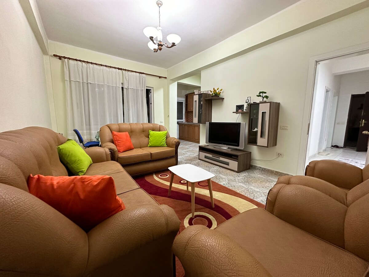 Geniş mənzil (140 m2) birbaşa çimərliyə, mənzilinizin dalğalarını hiss edə və eşidə bilərsiniz. Möhtəşəm mənzərəsi olan bu mənzil Durresi Çimərliyində ən populyar ərazidə yerləşir. Maksimum tutum 7 nəfər üçün nəzərdə tutulub; Qonaq otağı, iki yataq otağı, iki hamam otağı və iki eyvan. - 1-ci otaq - İkinəfərlik çarpayı və bir nəfərlik çarpayı. - Otaq 2 - İki birnəfərlik çarpayı. - Qonaq otağı - böyük divanlar 2 nəfər üçün uyğundur. Uzunmüddətli qonaqlamalar üçün çox rahatdır. Hörmətlə, Super Ev Sahibi Armandanız 😇