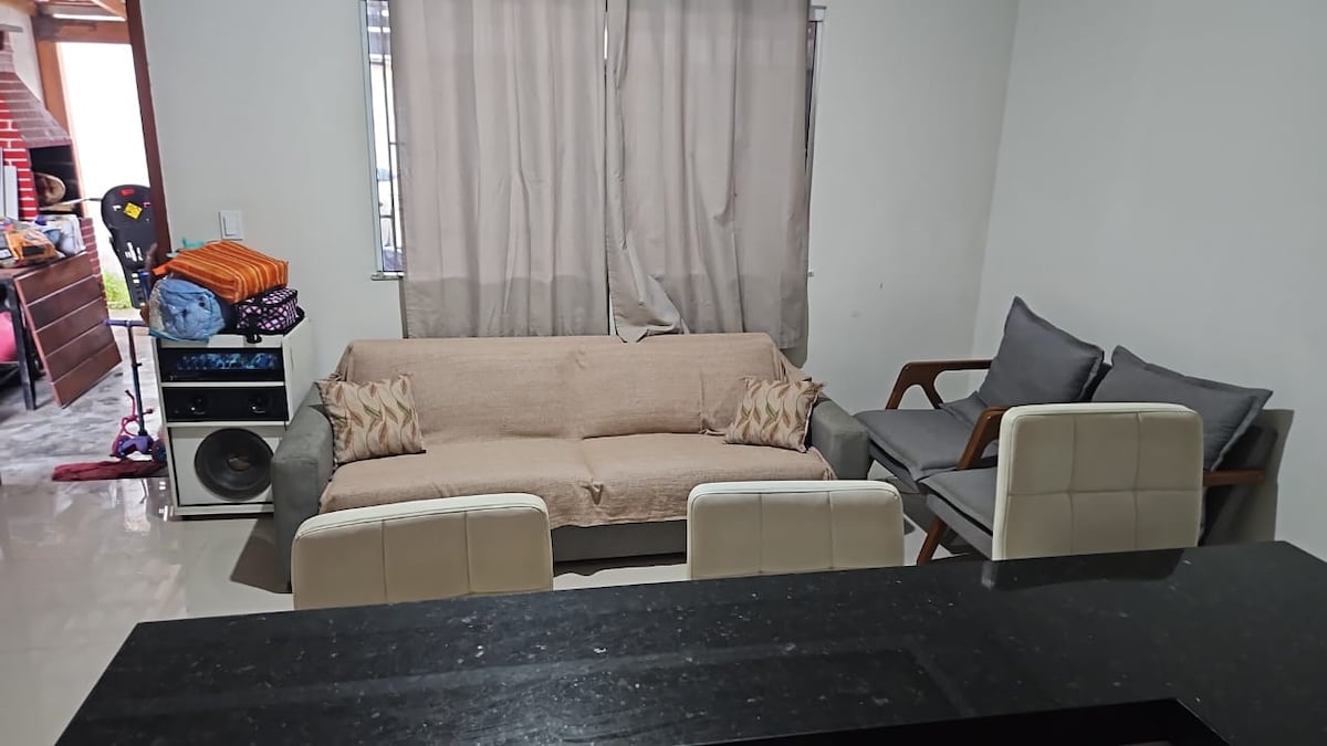 Casa mobiliada, segura e arejada. 2 quartos espaçosos com persianas anti-alérgicas, telas mosquiteiras e grades nas janelas, quintal gramado, churrasqueira, portão automático, interfone, INTERNET 400MB. Quarto I c/ cama Queen Size e split, quarto II com 3 camas de solteiro, ar condicionado e TV apenas p/ receber video-game. Sala com SmartTV 40"c/IPTV), ventilador teto e sofá, cisterna , caixa d'água com bomba automática. Enxoval e utensílios domésticos completo. Aceitamos Pet de pequeno porte.