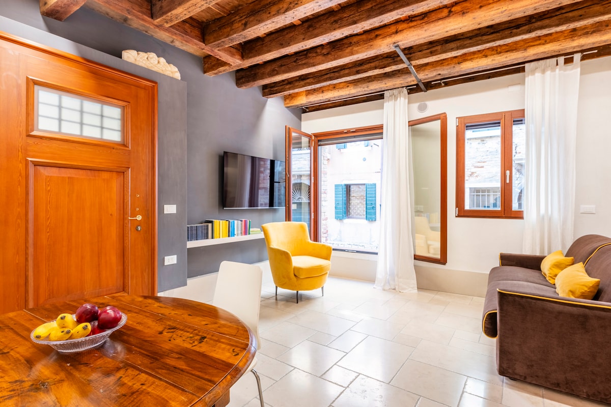 Kanal mənzərəli 60 kvadratmetrlik müasir mənzil, klassik Venesiya elementlərini (ənənəvi İstrian daş döşəməsi və taxta tavan) saxlamaqla bərpa edilib, Wi-Fi, 2 televizor, kondisioner, paltaryuyan maşın, fen, polad mətbəxlə təchiz edilmiş mətbəx (soba, nespresso, çaydan), divan çarpayısı olan qonaq otağı, kral böyüklüyündə ikinəfərlik çarpayı, fantastik vanna otağı var.