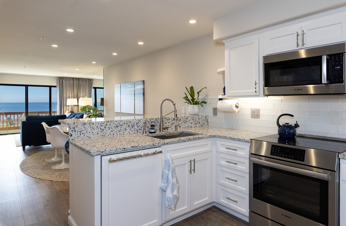 Enjoy beautiful sunsets from this newly remodeled North Bluff Villa, with crystal clean beach decor, comfortable king size mattresses, plus a beautiful queen size sofa sleeper. High end stainless steel appliances (in case you feel like cooking) Short walk to restaurants, Seascape Village Shopping, pool/hot tub, trail to the beach. Covered parking EV available, elevator takes you to the 2nd floor. Enjoy listening to your own tunes thru a custom sound system. TV w/ Netflix. Internet access.