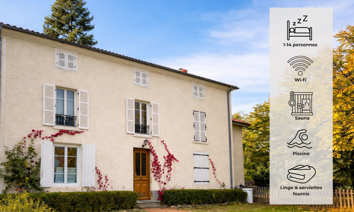 Besoin de calme et de vous retrouver en famille ? Cette belle maison en pierres vous attend pour un séjour dans un écrin de verdure. Il n'y a pas de doute vous allez tomber amoureux de la vue à 360° sur toute la région roannaise et les monts du Forez ! Si vous avez des enfants, ils trouveront tout ce qu'il faut pour passer un super séjour : salle de jeux bien remplie, jeux de société, billard pour les plus grands, piscine couverte et chauffée de mai à septembre, espace de jeux extérieur ...