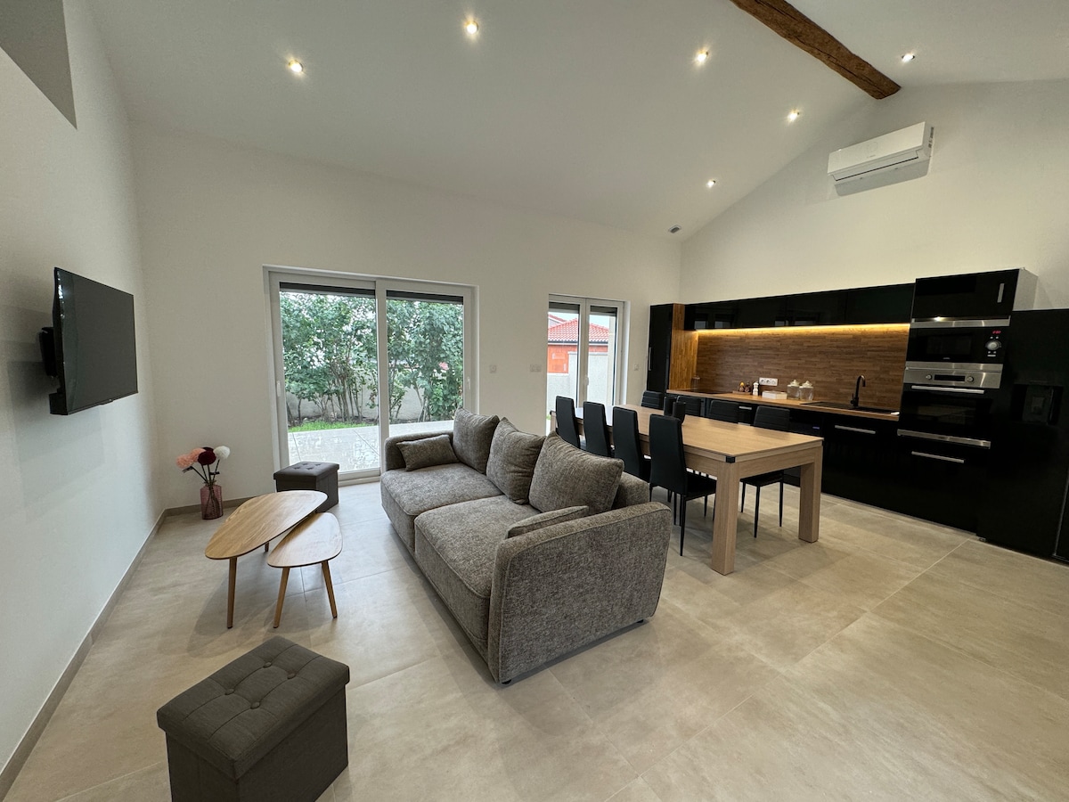Cet hébergement élégant style loft est parfait pour les groupes ou les familles. Vous y trouverez tout le nécessaire pour votre confort. A l'étage, deux chambres, un bureau et une salle de bain avec WC. En bas, un grand salon, canapé, coin TV avec cuisine américaine toute équipée et WC. Au calme et sécurisé, vous pouvez garer votre voiture dans le jardin. Grand patio est attenant à l'entrée de la maison. La maison comprend tout l'équipement nécessaire. Draps et linge de lit fournis.