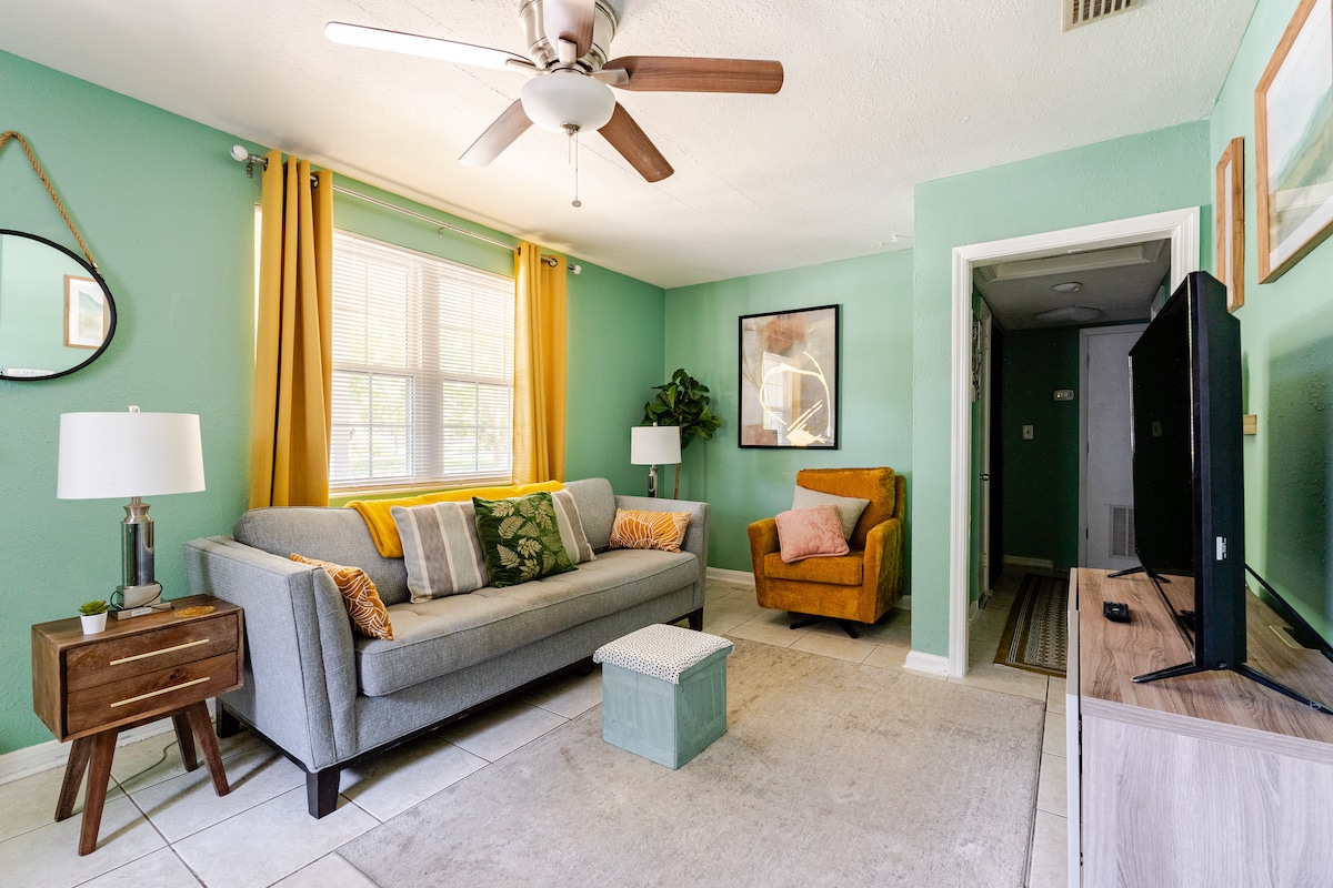 Bu cazibədar banqalo Ceksonvilin ən əyləncəli məhəlləsi olan Riversaydın mərkəzində yerləşir. Böyük çarpayı, ağıllı dinamiklər, sürətli Wi-Fi və axın kanallarından, eləcə də tam təchiz olunmuş mətbəxdən və adirondak stulları, elektrik qrili, od çuxuru və hətta "smores" dəstləri olan arxa həyətdən zövq alın. Kruizer velosipedlərimizlə (fincan və mobil telefon tutacaqları ilə) yerli mağazaları və restoranları araşdırmaq üçün fərdi tövsiyə bələdçimizdən istifadə edin. Ayrıca giriş yolu parkı da daxildir.