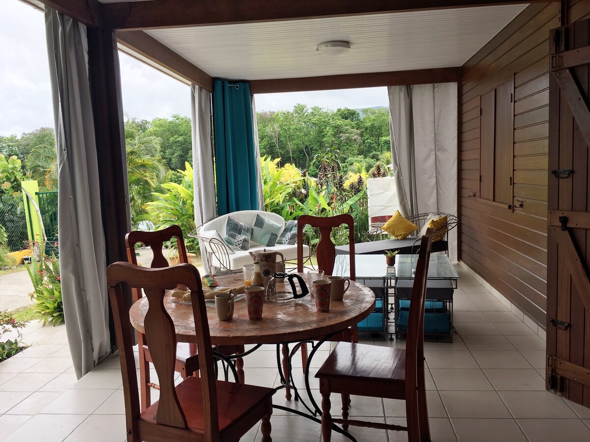 Cueillez chaque matin des bananes et des cerises pour votre petit déjeuner, dans le jardin luxuriant de ce magnifique gîte ouvert sur la nature. Très confortable et climatisé, lit kingside. Dans le jardin paysager vous pourrez observer des colibris... Petite surprise, on ne vous en dit pas plus !!! Situé au cœur du Parc National de Guadeloupe classé au Patrimoine Mondial de l'Unesco, le gîte vous permet d'allier détente à la plage toute proche et découverte de la forêt tropicale
